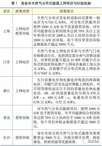 部分省份出台了天然气分布式能源的上网电价和补贴机制。目前上海市、江苏省、浙江省、长沙市、青岛市等省市出台了天然气分布式能源的上网电价和补贴机制,其中上海市采用上网电价和投资补贴相结合的机制,上网电价为单一制电价;江苏省、浙江省均采用两部制上网电价政策;青岛市、长沙市主要采用投资补贴机制。